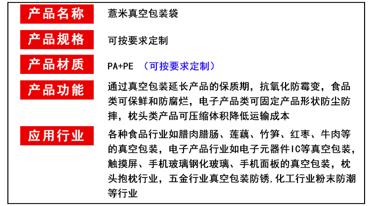 用途:主要是用来包装:主要用于大米、小米、黑小米、红米、糙米、黑香米、西米、大黄米、燕麦、薏米、黑小麦、荞麦、眉豆、红豆、黑豆、脱皮、绿豆、鹰嘴豆、赤小豆等五谷杂粮及豆类封装。