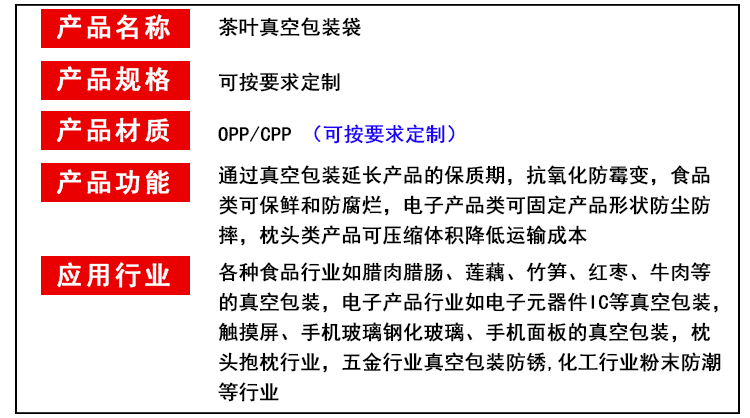 用途:主要是用来包装:各种茶叶、熟食制品、腌腊制品、干货食品、酱腌菜等食品。