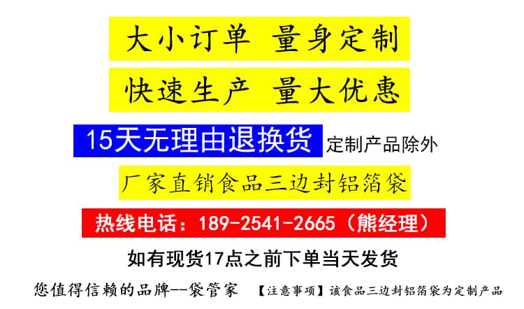 预付30%订金+所有铜版费用,生产完成后支付70%货款,待货款结清后出货。生产过程中我们会拍照与您确认印刷、切袋、成品等各种细节!