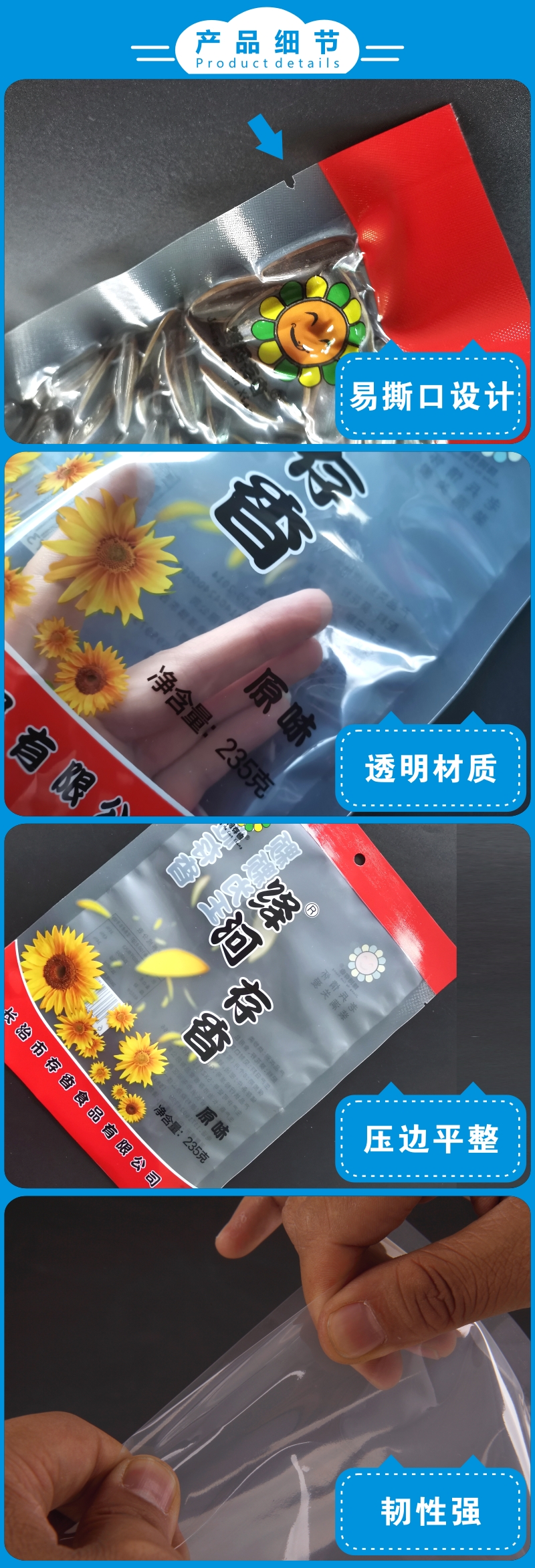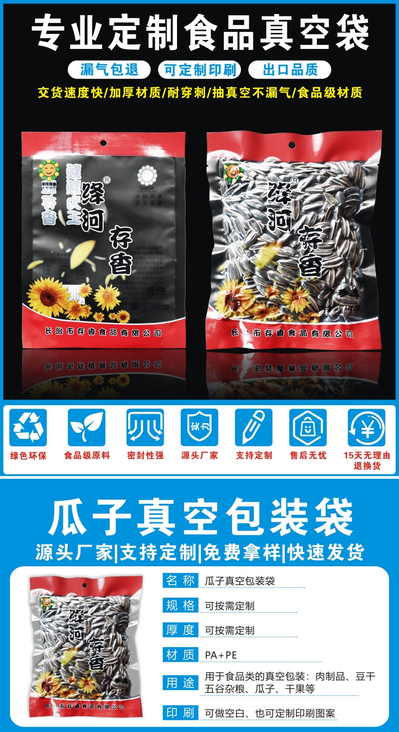 瓜子真空包装袋,食品级材质可提供相关检测报告,抗拉伸抽真空不易漏气;8色彩印,高精度完美印刷;规格、印刷可按需定制,质保一年;