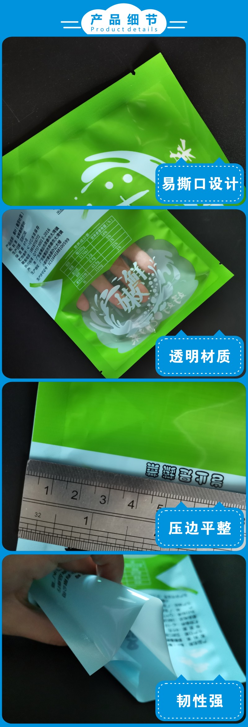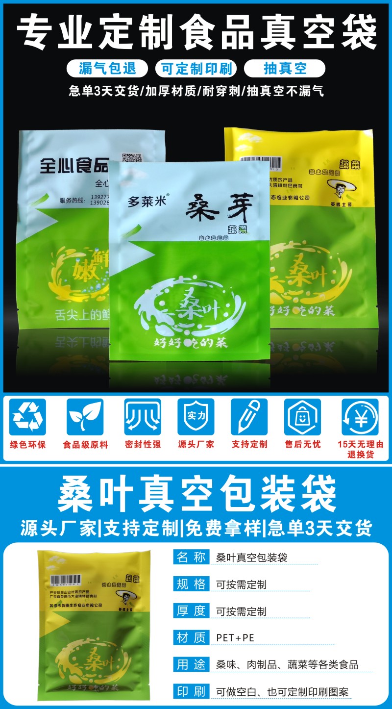 桑叶真空保鲜袋,柔软耐刺穿,抗冻不漏气;10MM宽压边,密封性更强;食品级材质,符合第三方检测标准;